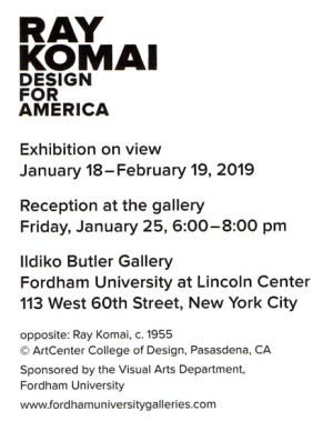 A new exhibition about the American designer Ray Komai opened this month in New York City at the Ildiko Butler Gallery, Fordham University at Lincoln Center, 113 West 60th St.