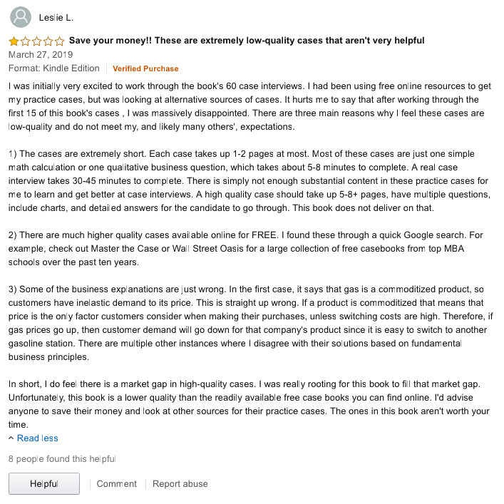 Still―and this brings me to our fourth and final issue―one would be duly warned of this book’s low quality if any negative reviews hung around. There were several, and the one below is a particularly well-written and accurate example. Indeed, Leslie L.’s criticism that the book’s explanations are often wrong is one quickly identified by Case Master Club and a critical piece of information to know about a prep book. However, this and all negative reviews for The Case Interview Workbook simply disappeared one day.